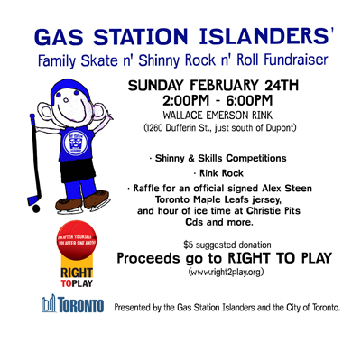 The Gas Station Islanders hockey club would like invite absolutely everybody to come out for an afternoon of shinny and hockey skills competitions for all ages at Wallace Emerson Park on Sunday February 24th. Peter Elkas, Dave Bidini, Tim Vesely, Paul Linklater, I Eat Kids, The Billie Hollies, Oldies 990 and Ben Gunning will perform an afternoon of outdoor rink rock. A donation of $5 is suggested with proceeds going to Right To Play (www.right2play.org), an organization that implements sport-oriented programmes for children in areas affected by war, poverty and disease.